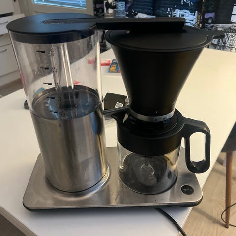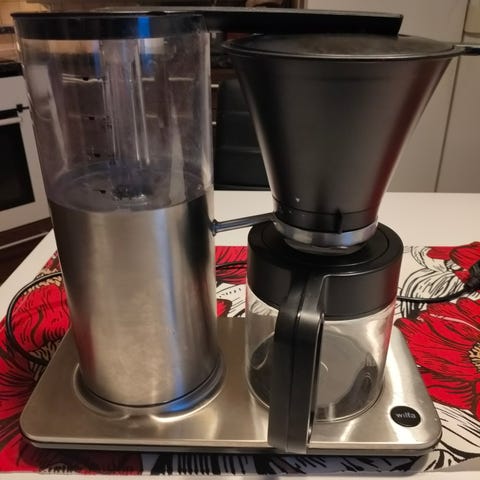 Noin neljä vuotta vanha keitin ylimääräisenä, pieni halkeama rungossa lämpölevyn vieressä, ei ole pudonnut vaan on ilmeisesti jonkinlainen tyyppivika. Kätevinä ominaisuuksina irroitettava vesisäiliö ja säädettävä suodatusnopeus