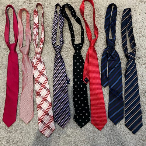 Miesten solmiot eri väreissä ja kuoseissa. Valikoimassa on muun muassa raidallisia, ruudullisia ja kirjailtuja malleja. Solmiot soveltuvat erilaisiin pukukokonaisuuksiin ja tilaisuuksiin. Siistejä ja ehjiä, säilytyksestä vähän ryppyisiä. Savuton, homeeton, koirakoti. Yhteishinta.