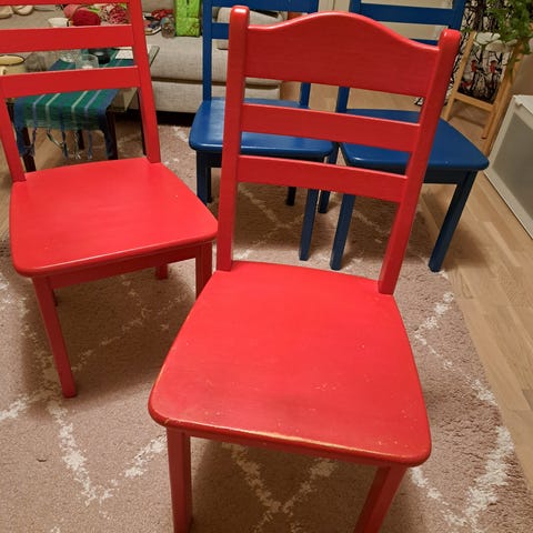 6 kpl ruokapöydän koivutuoleja. Petsilakattu ammattilaisella tummanruskeaksi. Tukevat tuolit, vähän elämisen jälkiä maalipinnassa.