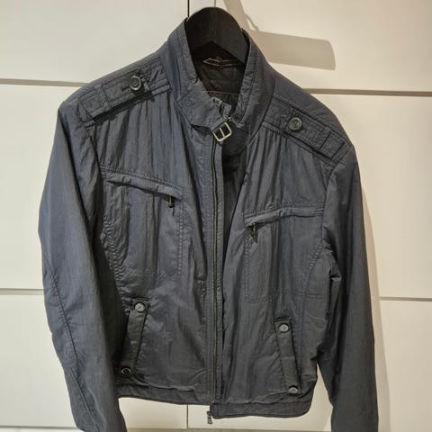 Kevyesti topattu miesten takki. Musta, punaiset raidat kauluksessa. Kiinnitys vetoketju + napit. 2 povitaskua. Vain vähän käytetty.