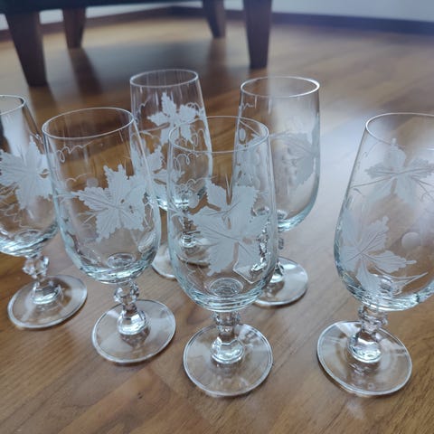 8 kpl muutaman kerran käytetyt, pölyiset, 25cm korkeat trumpetti lasit. Hankittu 90-luvun lopulla. Erittäin ohutta lasia. En postita. Kyljessä tarra "suupuhallettu".