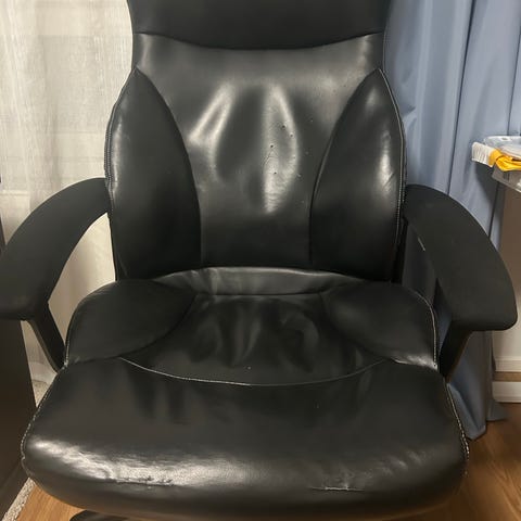 Annetaan toimistotuoli. Toimii hyvin. Kulumisen jälkiä on, etenkin keinonahassa.