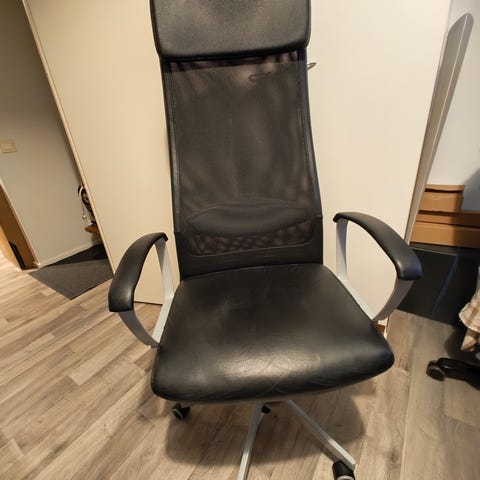 Nahkapinnassa on vuosien varrella kulumaa, mutta tuoli on muuten täysin toimiva.