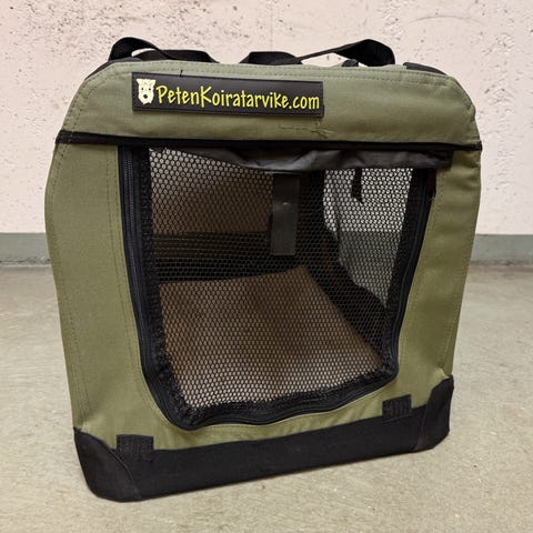 Koirankuljetushäkki, jossa aukeava sivu.