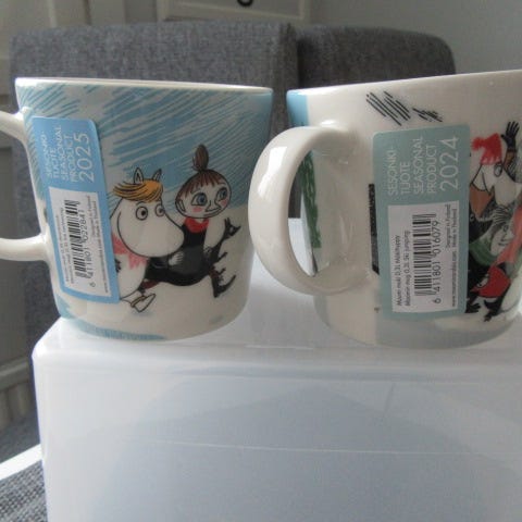 Kuvien mukaiset käyttämättömät muumi mukit Nuku hyvin ja Rantapäivä 2025 / Rantaelämää 2025 yhteishintaan.