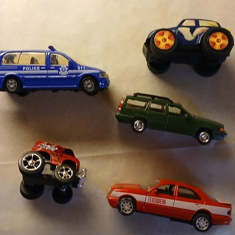Neljä leluautoa. Ehjuä kaikki. Käytön jälkiä kyllä on.
