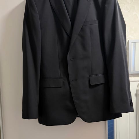 Musta Hugo Boss -puku. Takki koko 50, housut 48. Slim fit. Materiaalina upeaa 100 % puhdasta uutta villaa, vuori 100 % viskoosia. Materiaali stretchiä.