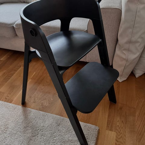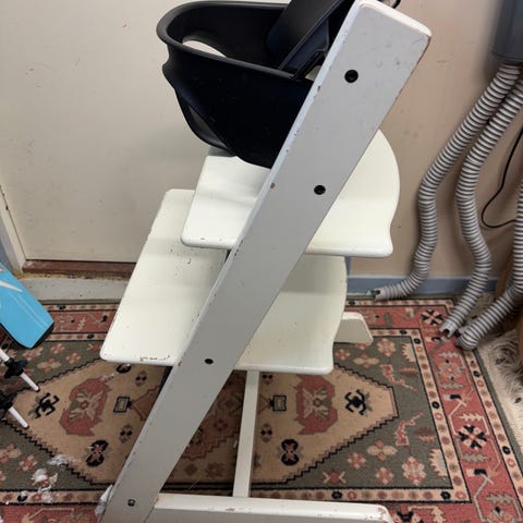 Stokken istuin ja pehmusteet sekä musta matkasyöttötuoli.