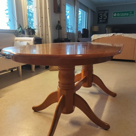 Kaunis, pyöreä pöytä. Tukeva. Sopii sivupöydäksi tai pieneksi ruokapöydäksi. Suklaan ruskea ja hyvässä kunnossa.