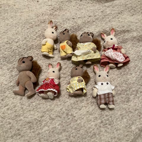 Sylvanian Families nalleperheen hahmot, kolme pehmeäpintaista nallehahmoa 90-luvulta. Mukana kaksi pukeutunutta aikuista nallea ja yksi pienempi nallelapsi. Lelut leikittyjä ja kulumia löytyy.