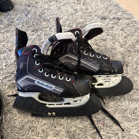 Koko epävarma, koska laput puuttuu. Mittanauhalla 21,8 mm. Terän profiili mielestäni hyvä ja muutenkin terät OK. Nilkkatuet ehjät. Nauhat eri paria ja toisessa ”jatkettu” ks. kuva - toimii kyllä.