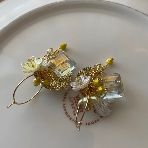 Uudet ja käyttämättömät korvakorut. Korvakorurenkaat kullattu teräs, riipus paljetti, korumetalli, lasihelmi, akryylihelmi, värit valkoinen, kulta, sininen, turkoosi.