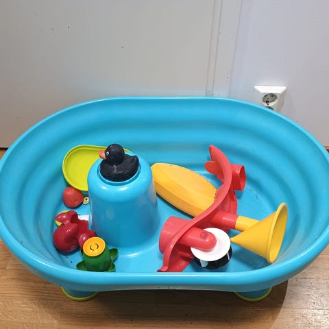 Vesileikkisetti pihalle tai miksei kylpyhuoneeseenkin. Setti sisältää AquaPlay Adventure Land + Container Crane Set + Fire Boat + Sail Boats. Veneitä yhteensä 6kpl, hahmoja 5kpl ja vesipyssyjä 2kpl. Ohjeet ja varaosa tiivisteet mukana. Ikäsuositus 3-7v. Yksi katon kiinnikkeistä murtunut, mutta saa ehkä liimattua eikä varsinaisesti haittaa leikkejä näinkään. Parissa kohtaa kanavaa tummentumaa. Kaipaa pesua, sillä ollut viimeksi pihaleikeissä.