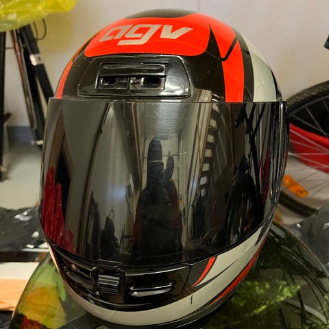 AGV kypärä tummalla visiirillä. Ei kaaduttu.