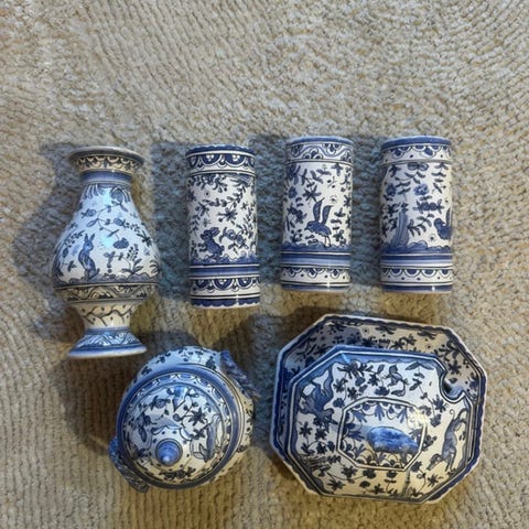 Unkarilaista käsinmaalattua posliinia. Oma alkuperäinen laatikko. Yksi kuppi ja pullon korkki puuttuu.