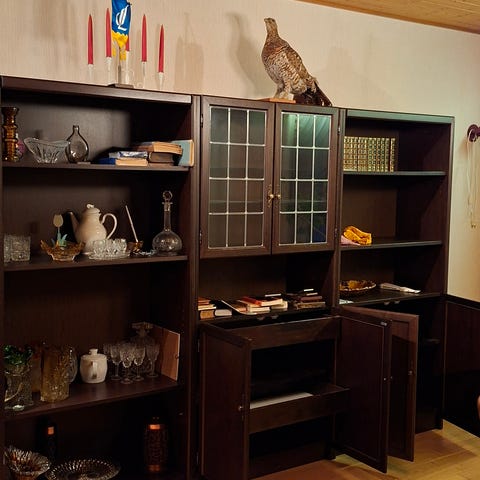 Hyvässä kunnossa oleva kirjahylly lasivitriineillä ja kaapeilla.