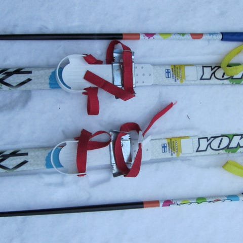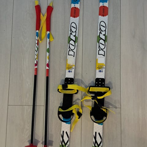 Kahdet Yoko YXT Classic Jr sukset ja sauvat sekä säädettävät remmisiteet jotka sopivat lasten talvikenkiin. Pituus 100cm.