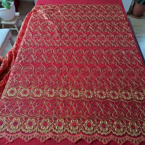 Kangas, jossa on kukkakuvioita ja raidallinen kuviointi. Väriltään vihreän, punaisen ja vaalean sävyinen. Kangas soveltuu esimerkiksi verhoiluun tai sisustustekstiiliksi. 90*140 cm.
