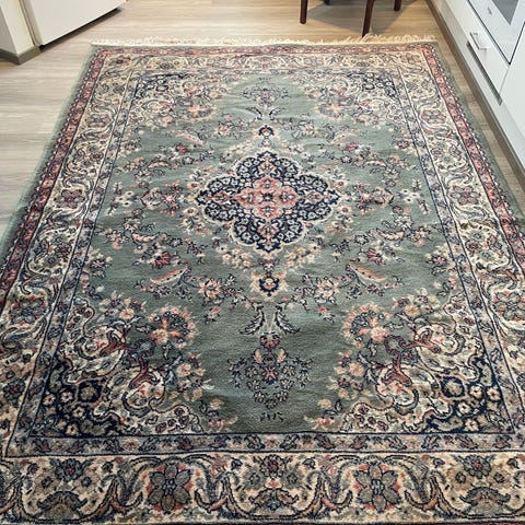 Aito vihreän sävyinen villamatto. Leveys 170cm ja korkeus 222cm ilman hapsuja. Maton molemmin puolin ommel hieman rispaantunut (katso kuvat). Itsellä ei häirinnyt käyttöä. Saa varmasti korjattua. Nouto.