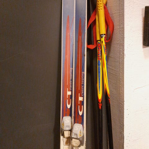 Käytetyt SNS-siteillä varustetut sukset. Pohjissa kulumaa.