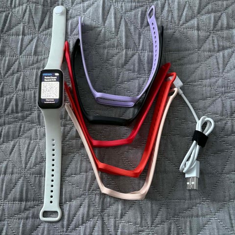Xiaomi Mi Band 2 älykello mustalla rannekkeella. Laite sisältää pienen näytön ja yhden painikkeen. Mukana latauskaapeli. Soveltuu aktiivisuusmittaukseen ja peruskäyttöön.