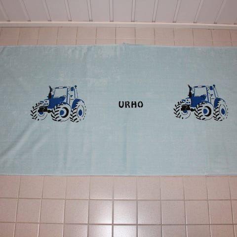 Uusi pellavasta ommeltu laudeliina/pefletti n.45x45cm, johon käsinpainettu traktori kuva.