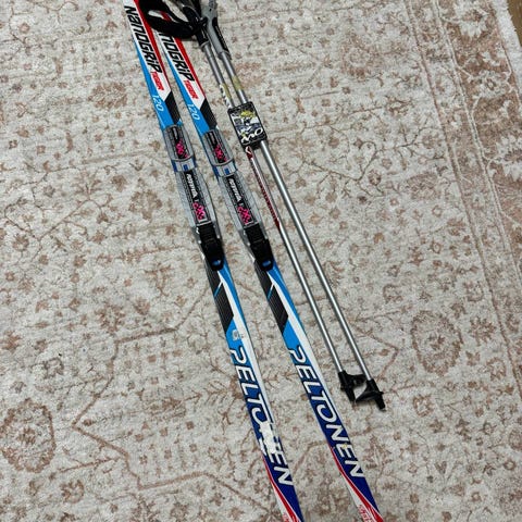 Peruskuntoiset sukset 125 cm. NNN siteet. Mukaan saa sauvat 95 cm.