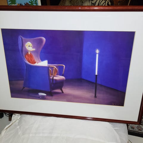 Kaj Stenvallin printti "Kenen siirto" vuodelta 1993. Työn korkeus on 40 cm ja leveys 55 cm. Lasikehys 60 X 73 cm.