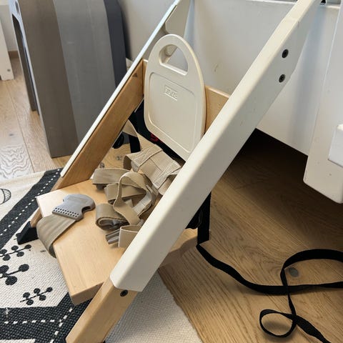 Stokke syöttötuoli/matkasyöttötuoli, jossa on pehmustettu istuin ja turvavyöt. Tuoli on suunniteltu lapsille ruokailukäyttöön ja tarjoaa turvallisen istuma-asennon.