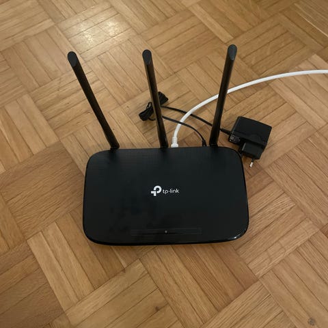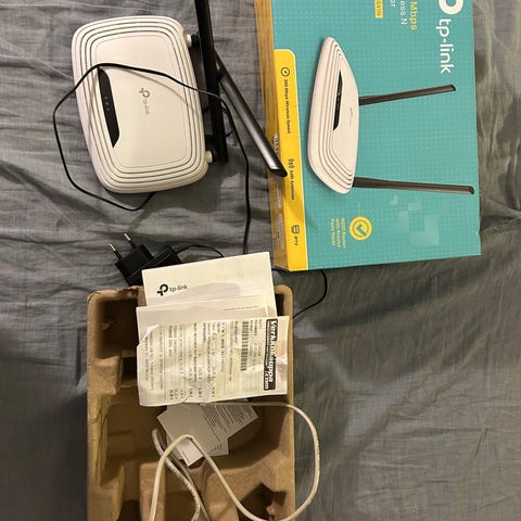 TP-Link TL-WR841N reititin, valkoinen väri. Langaton verkkolaite, jossa on kaksi antennia ja mukana virtalähde. Sopii kotikäyttöön langattoman verkon luomiseen.