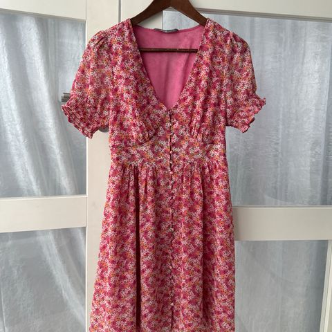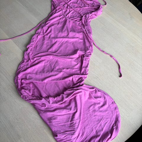 Ihana! 💗 Vaaleanpunainen pehmeää puuvilla-viskoosia tms, kauniit nyörit selässä. Ylettyy puoleen sääreen, joustaa. Laput poistettu.