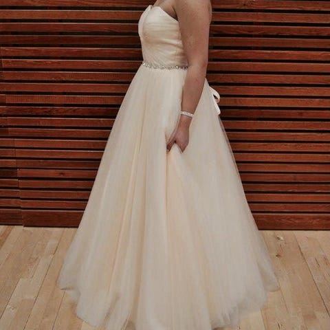 Juhlapuku Bellasta (nyk. Zazabella) ostettu kaunis persikanvärinen timattivyötäröllä korstettu vanhojentanssimekko. Koska mekkoa saa kiristettyä hyvin korsettimaisen yläosan vuoksi, sopii mekko moneen kokoon arvioisin että menee S-L koista. Vaikka mekossa ei ole olkaimia, se pysyy hyvin paikoillaan eikä valahda alas vaikka tanssisi. Mekossa ei ole käytön jälkiä ja sitä onkin pidetty vain muutaman kerran päällä! Mukana tulee tylli alushame :)