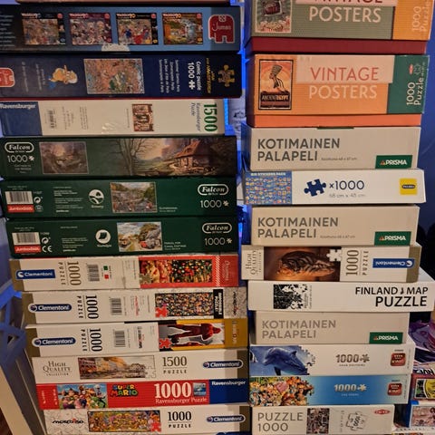 Uusia ja osa kierrosta tulleita, hyväkuntoisia palapelejä. 500 palan palapeli 2 euroa/kpl, 1000 palan palapeli 4 euroa/kpl