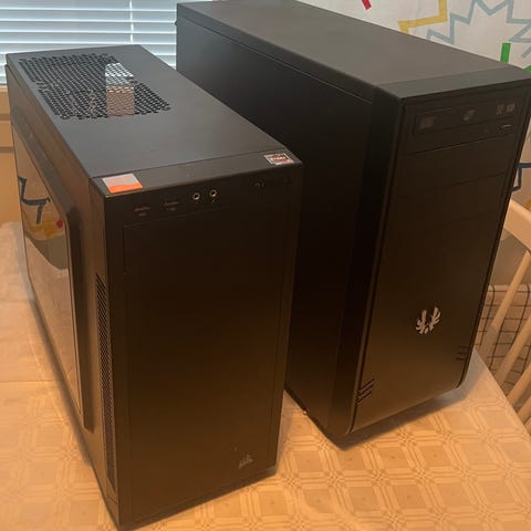 Emolevy, Celeron prossu, näytönohjain, tuulettimia,lisä kortteja, korppuasema, paljon eri johtoja, yms.