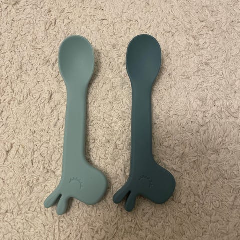 Silikoniset Done by deer -lusikat vauvalle tai taaperolle. Vaaleanpunainen ja violetti. Hyvä kunto.