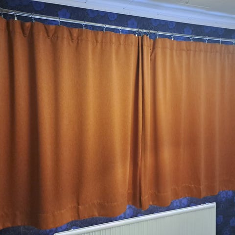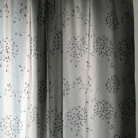 Eurokankaan ammattilaisen ompelemat verhot, jossa on lehtikuvioita mustalla, harmaalla ja vihreän eri sävyissä. Yläreunassa vahvike. Korkeus 124cm leveys 131.