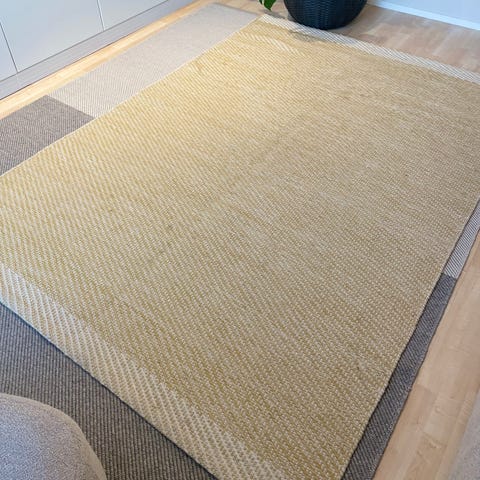 Linie Designin Rainbow- villamatto, väri valkoinen. Toisella puolella tahra joka ei ole lähtenyt sappisaippualla, toisella puolella myös haalea tahra. Pesulaa tai tekstiilipesuria en ole kokeillut.