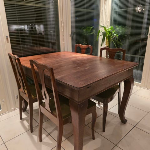 Vanhat, antiikkia? Jykevät ja painavat. Jatkettava ruokapöytä ja 6 tuolia. Pöydän koko n.90x150cm ja molemmissa päissä ulos vedettävät jatkopalat n.55cm tulee lisää molempiin päihin. Pöydän pinta vaatii käsittelyä ( meillä ollut liina päällä ). Tuolit myös vaatii uudelleen päällystämisen, kuten kuvissa näkyy ovat tahraisia ja muutamassa tuolissa on istuinosan verhous rikki. Nouto Överby Kirkkonummi.
