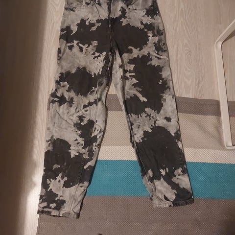 Mustat housut. Joustavaa farkkukangasta. Kuviointia ja ”maaliroiskeita”.