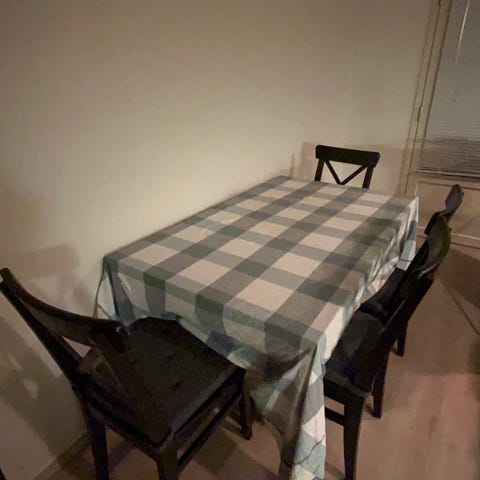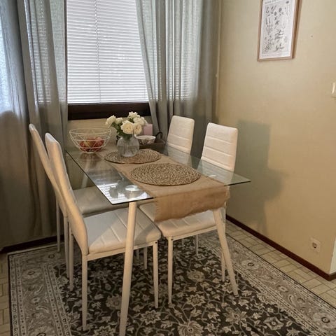 140x84cm (jatkopala 40cm) jatkettava Ikean pöytä + 4 tuolia. Pientä normaalia kulumaa.