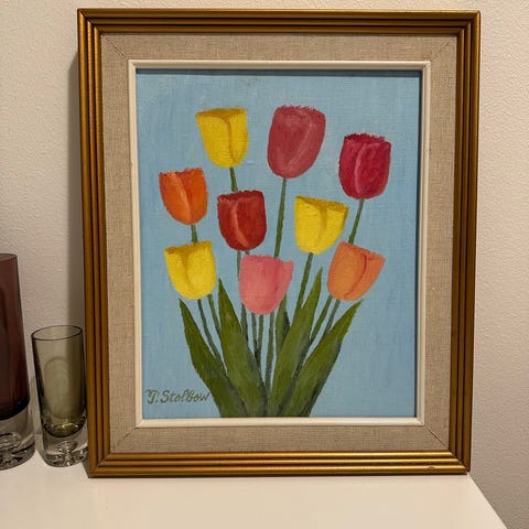 Alexandrova V.S. öljyvärimaalaus tulppaaneista, tehty kankaalle. Maalaus on vuodelta 1972 ja siinä on puinen kehys. Teos on signeerattu ja siinä näkyy valmistustiedot kankaan takana.
