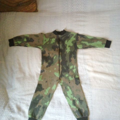 Meni meillä koot 116-128 :) ja oli suosittu myös sisällä pyssyleikeissä. Yhdellä lapsella ollut. Pesty vain villanpesuaineella. Koiratalous.