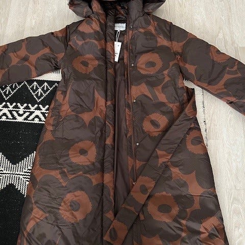 Marimekko ruskea Suoja Unikko takki koossa s, koko on reilu ja menee myös koossa m. Takki on uusi ja käyttämätön. Edessä vetoketju ja nepparit, sivussa taskut, vyö ja huppu. Sivusaumojen alaosassa myös vetoketjut, joilla helmaan saa lisää tilavuutta. Hinta uutena kaupassa 540€. Nouto tai postitus 8,90€.