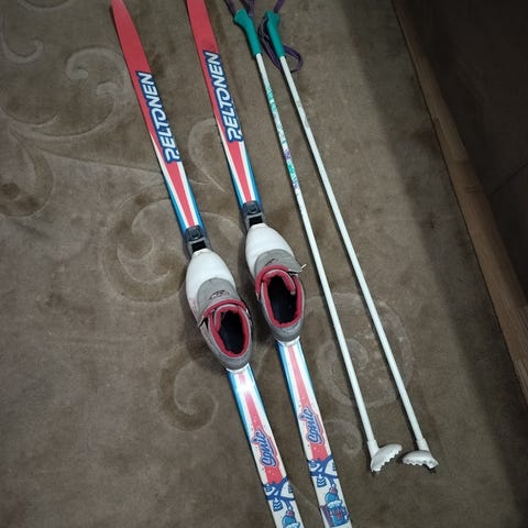Käytetty lasten suksipaketti. Sukset 147, siteet nnn, monot kokoa 36. Sauvojen pituus 105cm.
