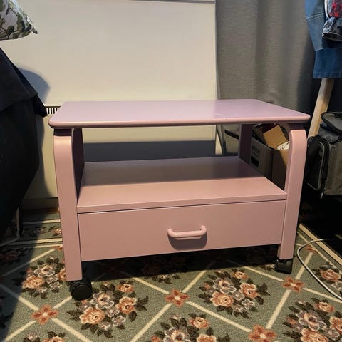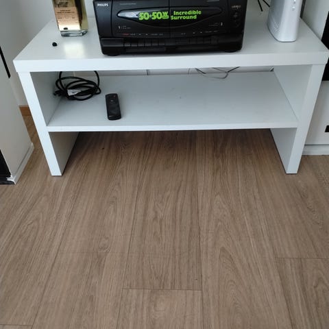 Pieni tv taso, rullat alhaalla. On kulumia mutta yleisilme siisti. Näppärä pieneen tilaan.