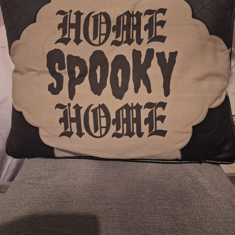 Sourpuss koristetyyny musta tekstillä "Home Spooky Home"
