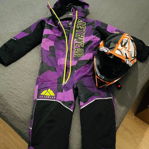 Lasten todella lämmin ski-doo kelkkapuku/toppapuku. Housuissa ja takissa kokomerkintä 6 ja ollut käytössä lapsella, jolla vaatekoko noin 116cm-120cm. Housuissa säädettävä lahkeenpituus jatkopalojen avulla, kuvissa toinen lahje jatkopalalla ja toinen ilman. Irroitettava huppu.