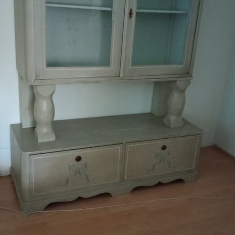Myydään antiikki tyylikäs astiakaappi, jossa on kauniit koristeelliset yksityiskohdat. Kaapissa on lasiovet ja kaksi lasihyllyä, jotka tarjoavat runsaasti tilaa astioiden esillepanoon. Lasivitriinissä on valo, itse asennettu.