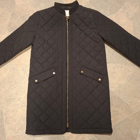 Myydään musta vintage tikkitakki. Klassinen trenssimalli, jossa kaulus, vyö ja taskut. Päällikangas paksua puuvillaa ja täytteenä vanua.