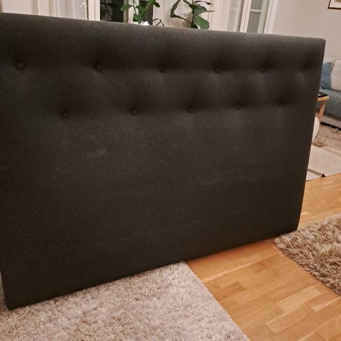 Tummansininen metallinen sängynpääty messinkisillä yksityiskohdilla